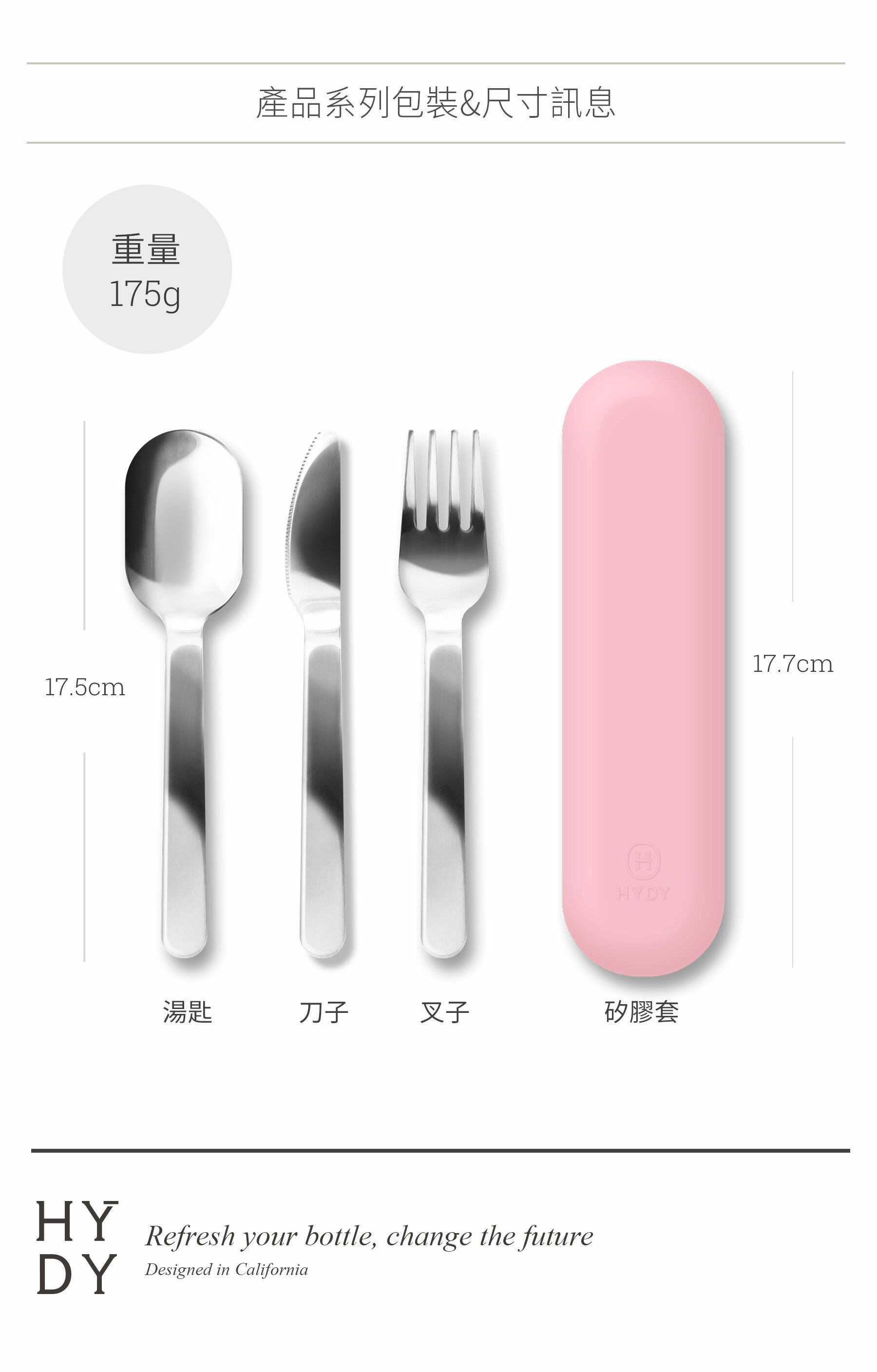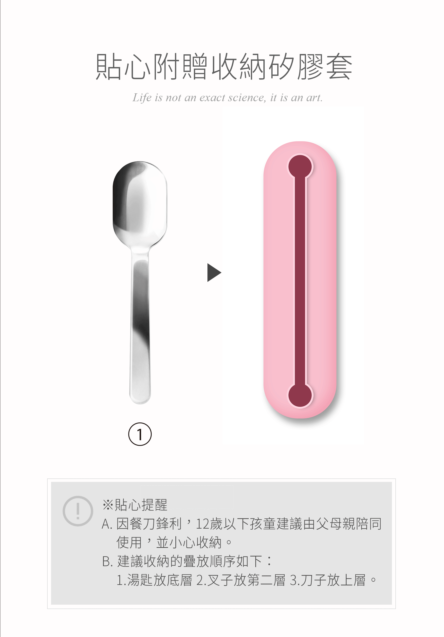 • 內容 : 刀子、叉子、湯匙 (附贈收納矽膠套 : 耐熱220°C)
